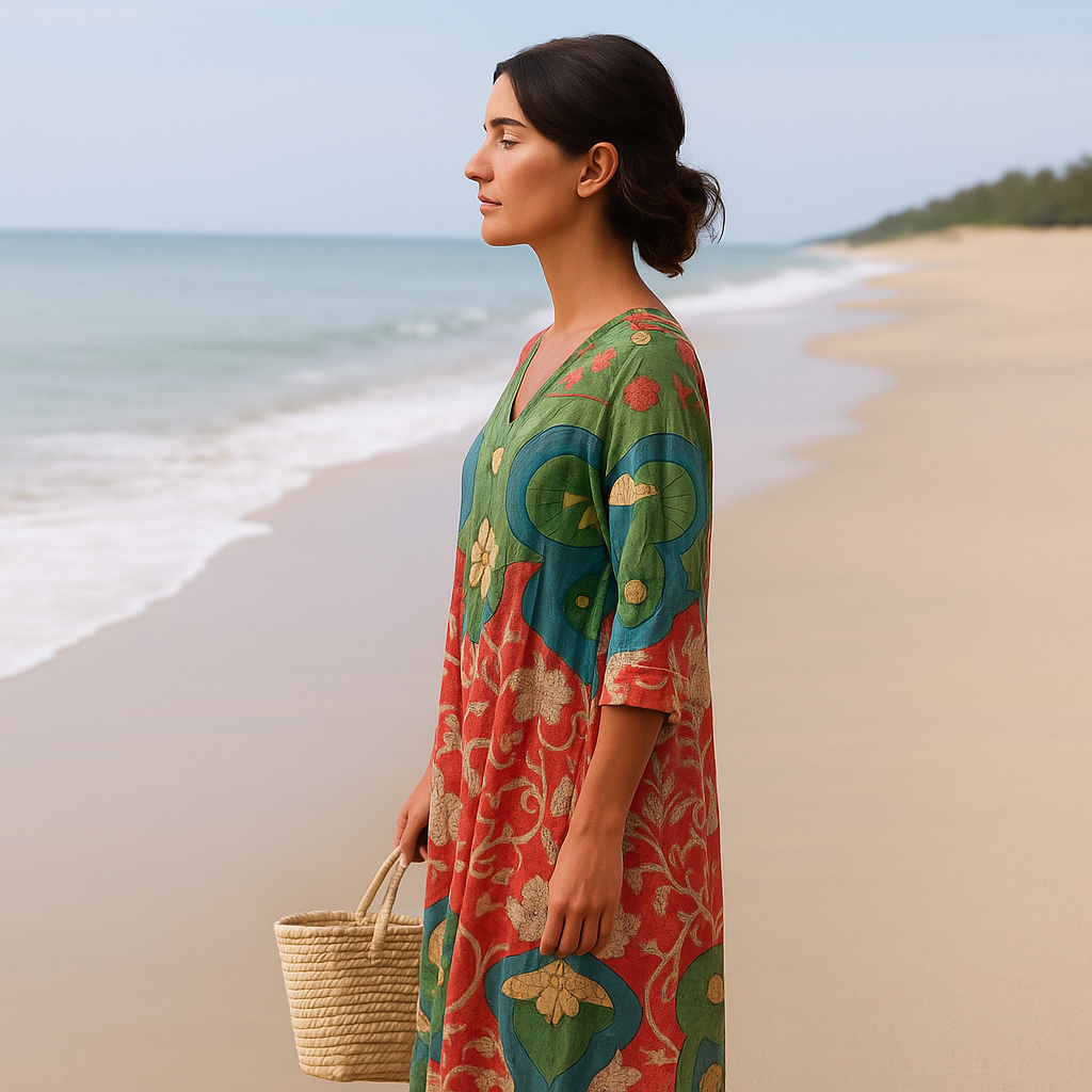 This elegant casual dress combines vibrant patterns with a relaxed silhouette, making it ideal for both seaside walks and everyday outings. With its V-neckline, three-quarter sleeves, and flowing skirt, it balances ease with eye-catching charm.