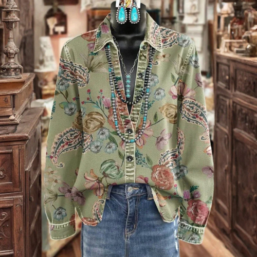 This blouse brings easy polish to your wardrobe with a neat collar, long sleeves and a softly structured drape. A gentle green hue, scattered with delicate florals and refined motifs, lends warmth and quiet femininity. The front buttons invite styling your way—wear open as a light layer or fastened for a clean, composed line. Pair with denim at the weekend or tailored trousers for the office.
